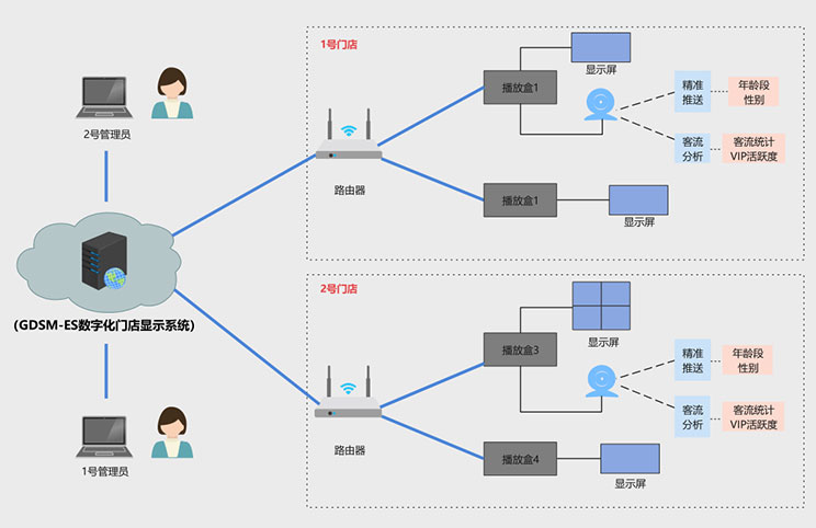 该客户为宁波地区零售门店,在一段时间内,客户发现门店销售额持续下滑,但是不知道原因出在哪里,到底是消费者减少,还是广告推送出现问题,亦或是其他原因,客户没有头绪,好博(中国)体育科技数据化门店显示系统完美的解决了客户痛点,方案拓扑图如下: