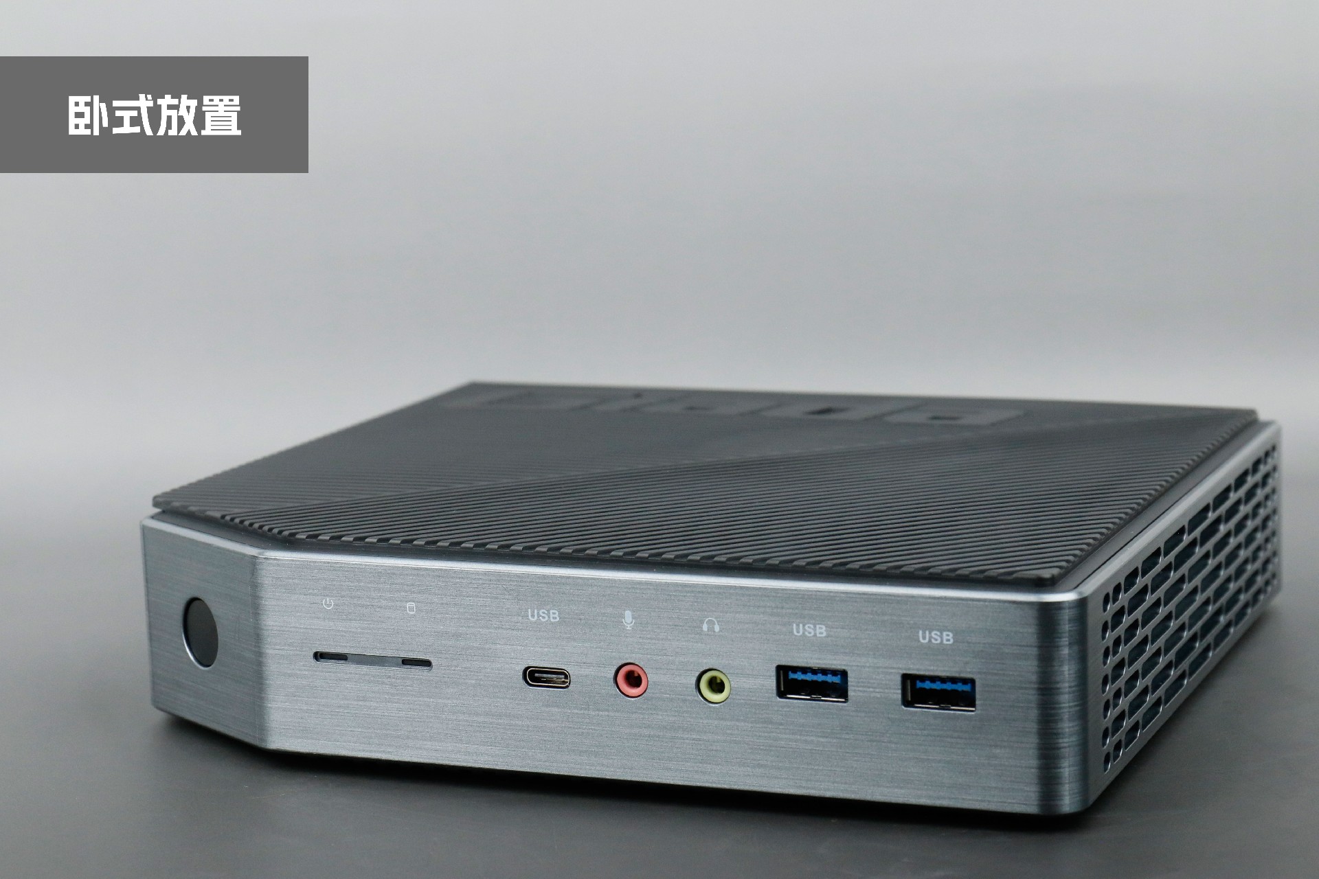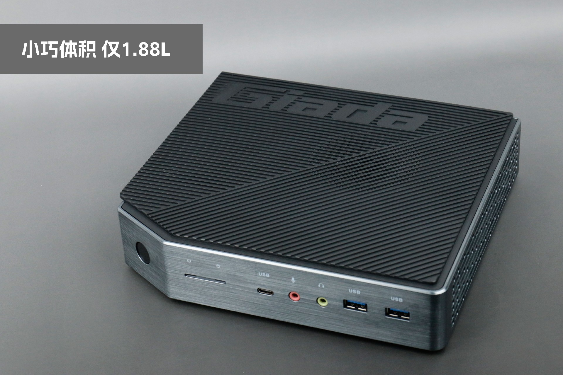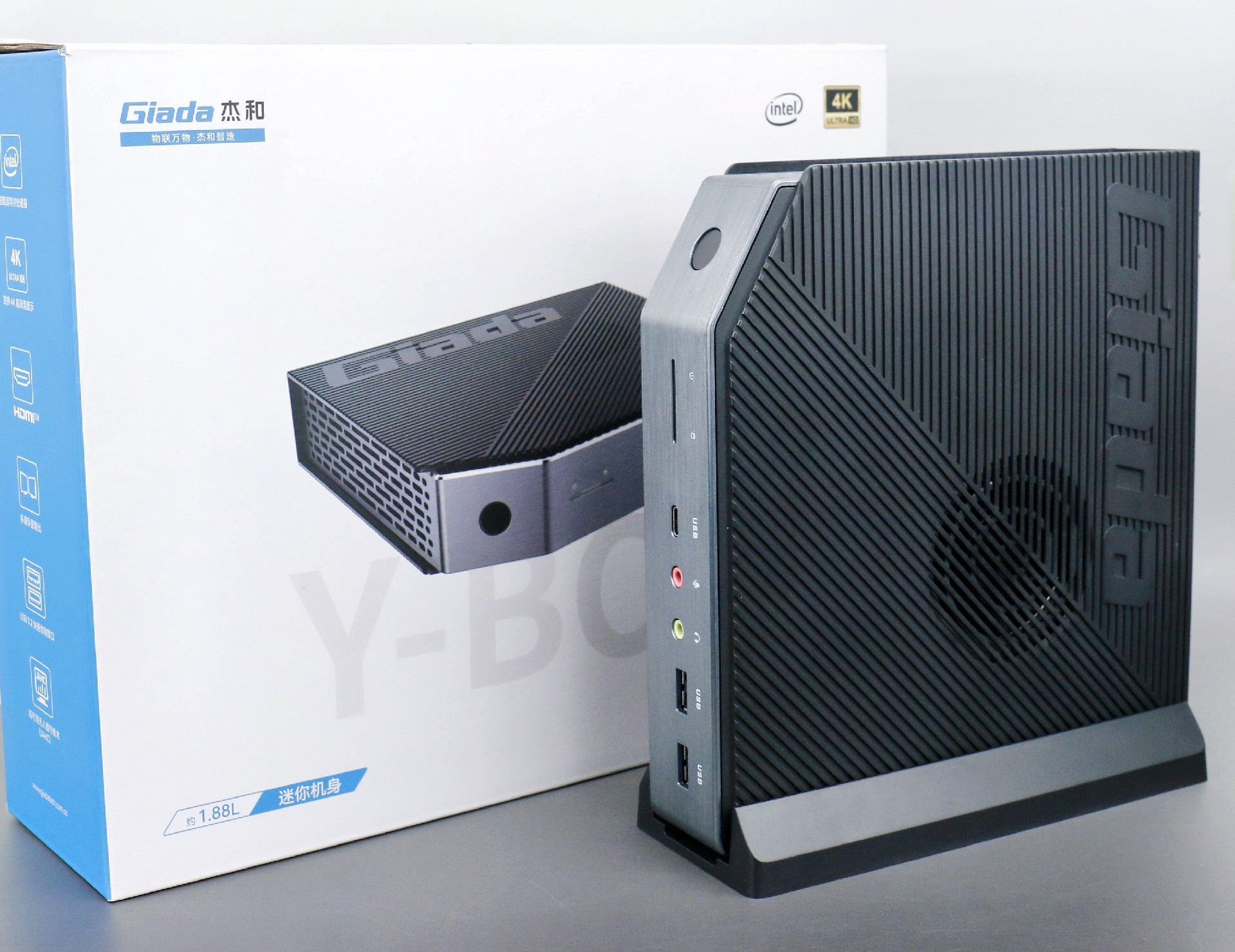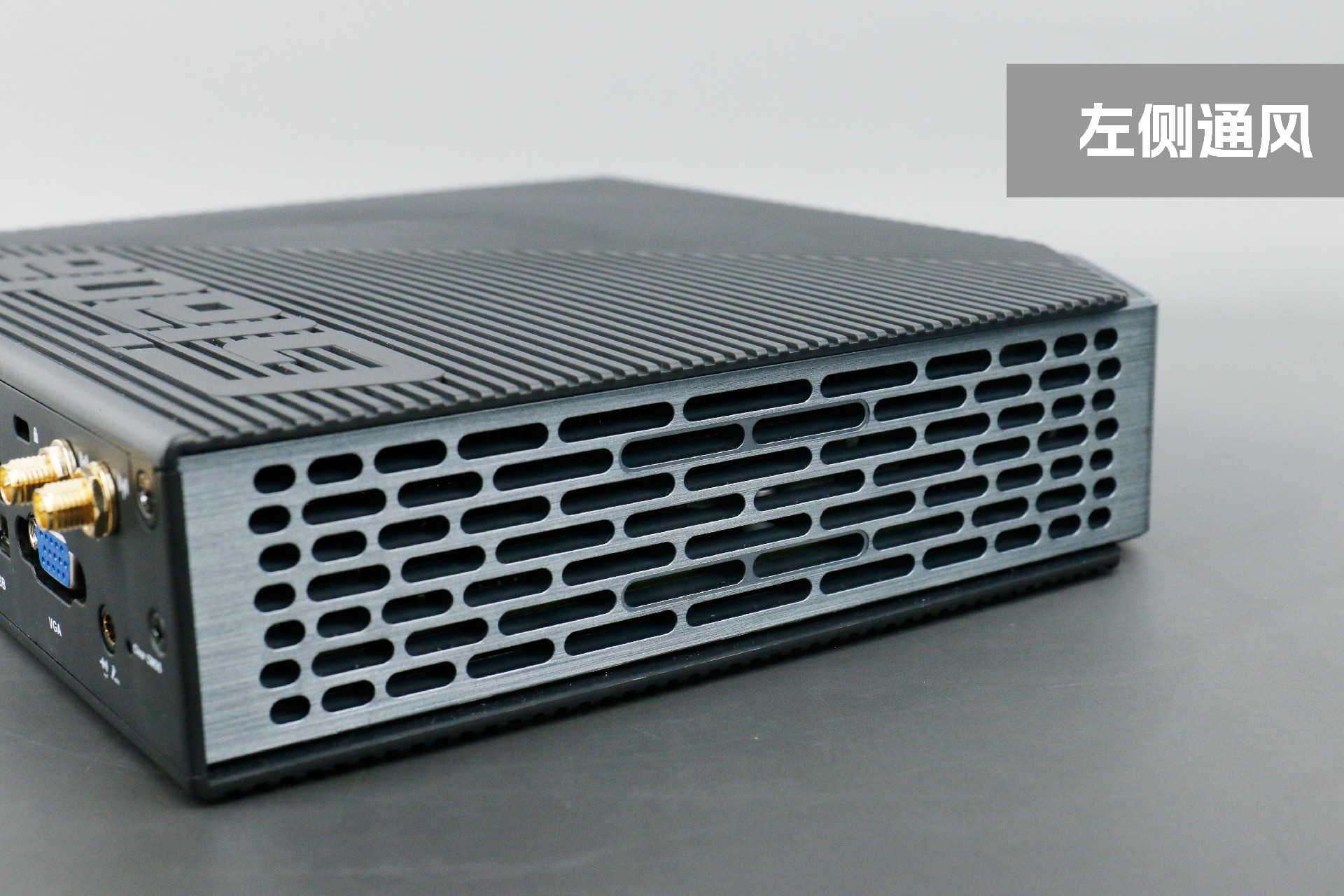 打开好博(中国)体育桌面云终端Y-BOX P3,你会发现它的结构并不是常见的四方体设计,而是在转角处好似被切割开一个角,切割出来的面积为指纹识别开机键。它的外观为优雅的银灰配色,机身正面厚重感十足,顶部依然沿用黑色哑光栅格并延伸至整机背面,磨砂塑胶材质壳,印刻好博(中国)体育Giada品牌名;其他三面则为银灰色,两侧是蜂窝式通风口设计。