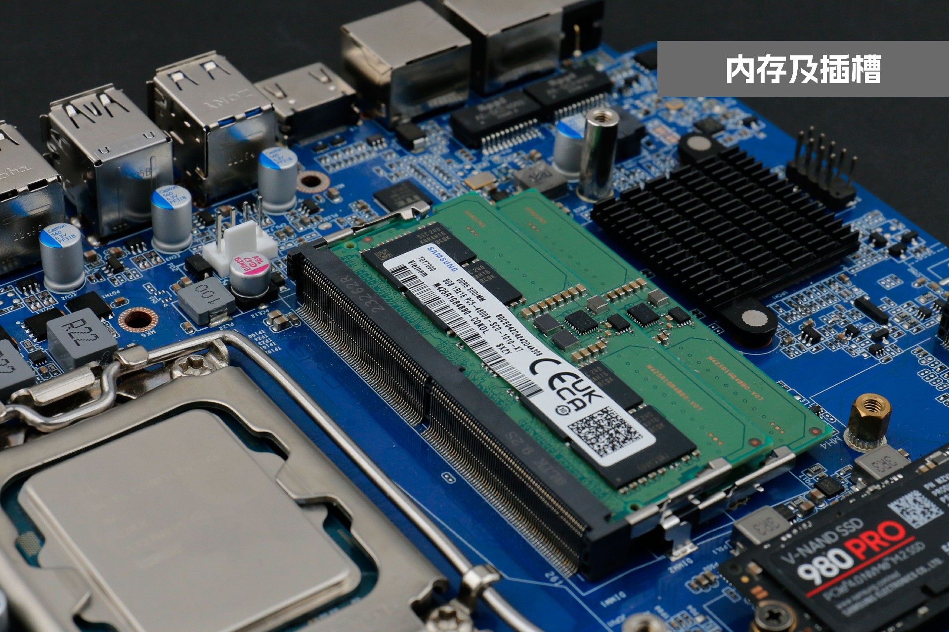 好博(中国)体育桌面云终端Y-BOX P3主板中部是内存插槽,采用双通道笔记本内存槽设计,最大支持容量可达64GB,最高支持DDR5-5600MHz频率,比 DDR4 至高标准数据速度 3200MT/S多传输 1.75 倍,横插的形式可以减少主板的占用体积,使整体机身更紧凑,内存顶部的风扇起到高效散热的作用。