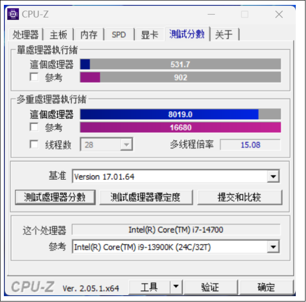 用户关心的CPU及内存也遥遥领先,CPU实测单核得分531.7左右,多核8019.0;内存方面实测DDR5内存读取速度为77739MB/s,写入速度为75824MB/s,复制速度为76843MB/s。