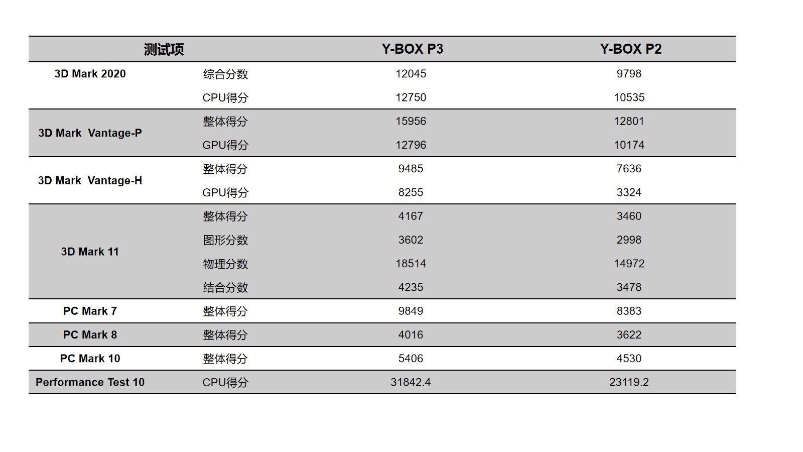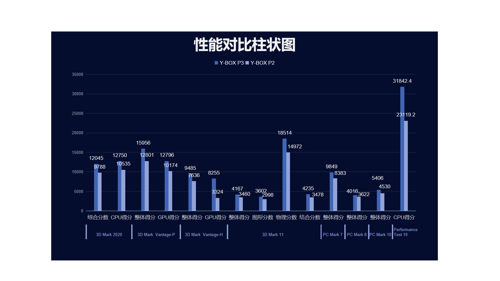 好博体育来具体看看各个测试项目的跑分情况,好博体育分别用3D Mark、PC Mark以及Performance 10等不同系列不同软件进行跑分,测试项目涵盖显示性能测试、系统性能测试、CPU性能测试等。通过下面的表格及柱状图可以看出,好博(中国)体育桌面云终端Y-BOX P3的数据在各项性能上都得到了大幅度提升。