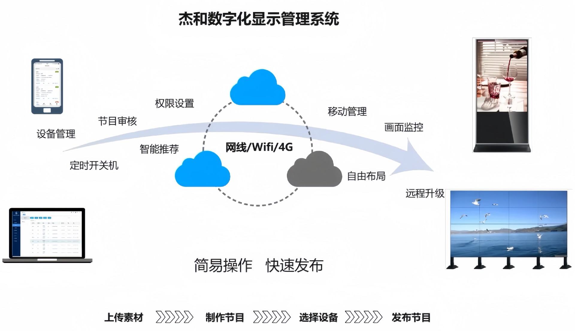 目前好博(中国)体育科技GDSM-ES系统覆盖市场上多形态网络智能显示终端,满足行业全产品业态需求,如广告机、LED显示屏、LCD拼接屏 、普通液晶电视等各种显示终端,广泛用于广告宣传、通知公告、指示引导。