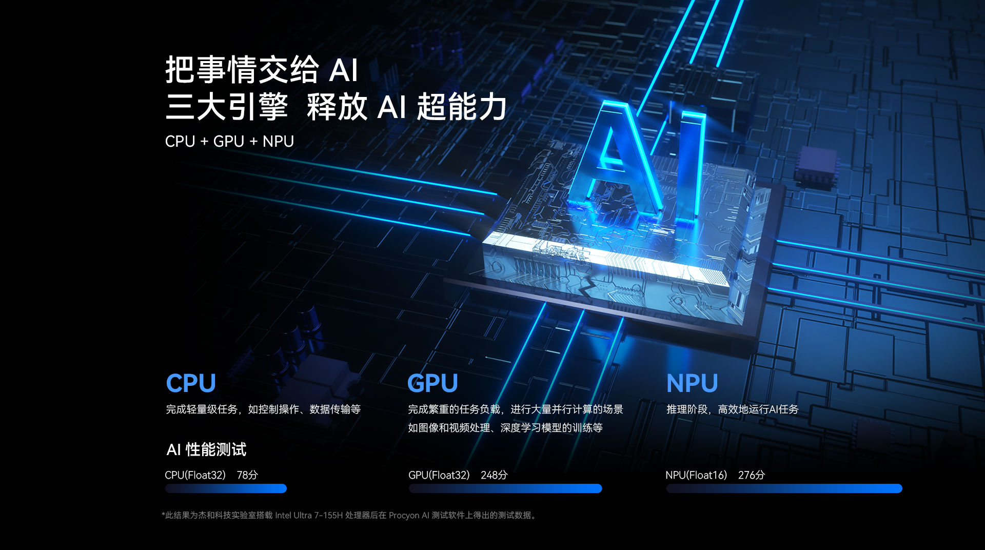 好博(中国)体育科技N601搭载了Intel® Core™ Ultra处理器,可选配Ultra 5- 125H或Ultra 7-155H,全新架构拥有CPU、GPU 和NPU配置。在好博(中国)体育科技实验室里,好博体育专门用 Procyon AI 这款 AI 性能测试软件对搭载了 Ultra 7-155H 处理器的 N601 进行了测试。最后测试结果显示,N601的CPU分数为78分,GPU 分数为248分,NPU分数为276分,这意味着N601在AI处理方面具有显著优势,能够高效地处理复杂的神经网络计算任务。