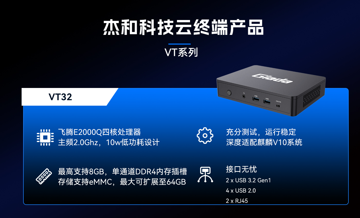 近期好博(中国)体育科技推出的云终端VT32,以国产飞腾E2000Q芯片作为核心处理器,深度适配国产银河麒麟V10系统,在政务、金融等对数据安全要求极高的领域深受关注。