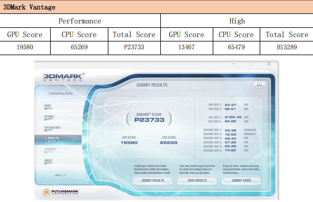在3DMark Vantage中,Performance模式下GPU得分为19580,High模式得分为13467。该测试反映了设备在不同画质等级下的图形处理能力,从这两个成绩来看,WA814能够轻松胜任4K剪辑、三维建模、动画制作等高负载任务。