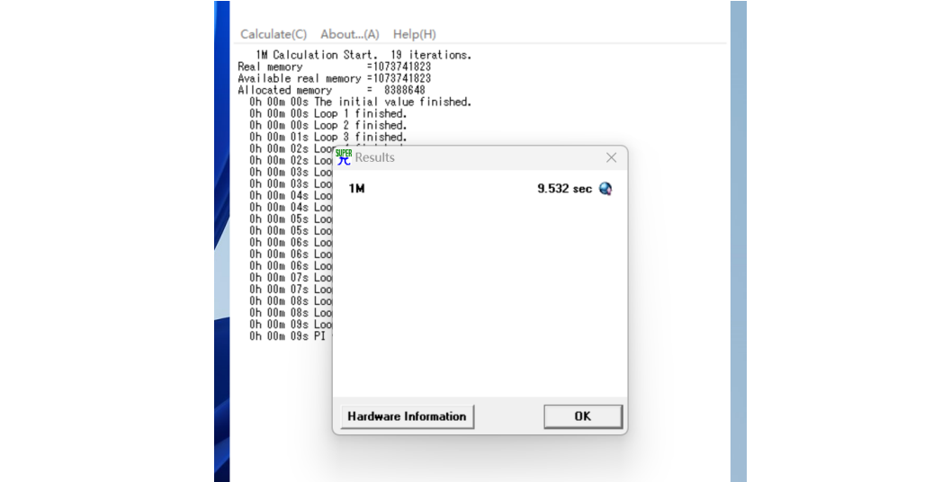 为了评估 CPU 的性能,好博体育使用了Super PI 1.1 进行了测试,软件以用时为参考成绩,花费时间越短代表计算性能越强。在本次测试中,Core i5-13400 处理器用时 9.532 秒完成了计算,属于当前中端处理器的主流水平,足以应对日常编码、分析和轻量建模任务。