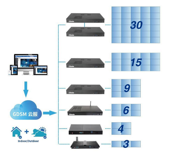 与常规分屏展示方案不同,在好博(中国)体育拼接控制器的视频输出能力和GDSM系统分组设置能力的组合下,店铺可以随时调整的拼接放置样式;快速设置屏幕的拼接、分组方式;快速编辑制作并发布信息;是一套安装部署迅速、内容调整迅速、更新反馈迅速的一体化信息发布方案。