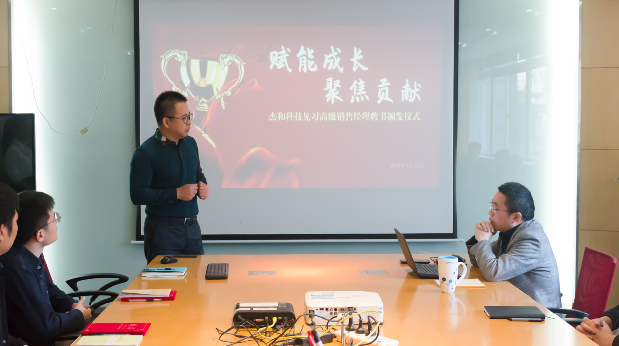 好博(中国)体育科技人力资源副总向总在本次仪式上做了开场致辞。向总首先向国际销售中心三位获聘同事表示了热烈的祝贺!公司为了更好的帮助三位同事成功转身,迎接从个体奋斗者向新经理转变的挑战,HR团队与国际销售中心已为他们精心制定了为期一年的培养计划,会通过外部培训、内部培训、行动改进计划、阅读指定管理类书籍、上级反馈与辅导、管理实践、内部管理研讨会等多种方式,为他们赋能,帮助他们成长。对见习高级销售经理的专项培养也预示着好博(中国)体育科技正式开启了2021内部人才培养的新征程!向总对三位见习高级销售经理提出了如下期许:“在战斗中学习,在学习中战斗,训战结合,成功转身,带领销售团队打胜仗!”