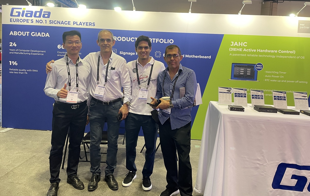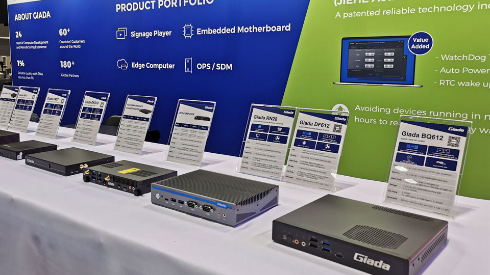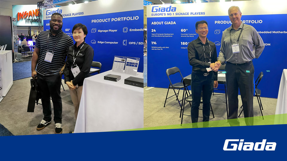 展会上Giada好博(中国)体育科技携最新的数字标牌和信息亭应用解决方案以及最新尖端产品惊艳亮相!其中最新的数字标牌播放器、边缘计算机和OPS(开放式可插拔规范)产品在现场备受关注,标志着Giada好博(中国)体育科技互动显示器和智能标牌解决方案领域的重大进步,也向全球参展观众集中展现了公司的非凡实力。