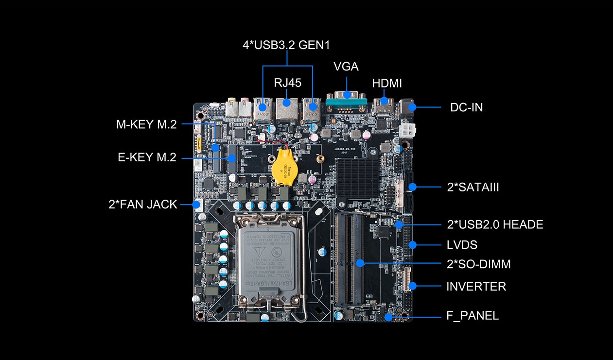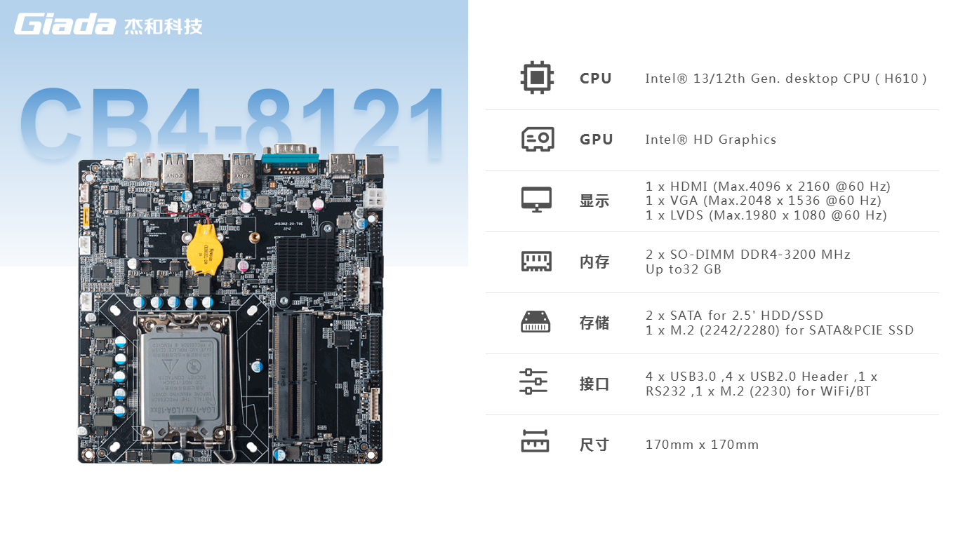 另外,一体机相对于传统的电脑更加美观,更加节能环保,而且一体机在使用体验方面也有独特的优势:比笔记本屏幕大,比台式机更简洁,也解决了一直为人诟病的台式机线缆多而杂的问题,因此,越来越多的教育办公、日常娱乐和学习的用户选择使用一体机。Giada好博(中国)体育科技根据市场与客户需求,推出这款高性能的一体机专研主板CB4-8121,带来全新震撼体验。好博(中国)体育科技主板CB4-8121是基于Thinmini ITX一体机标准设计,采用Intel Alder Lake-S平台H610芯片组,支持全新第13/12代Core i7/i5/i3处理器,搭载双通道SO-DIMM DDR4-3200MHz内存、1 x M-Key M.2 (2242/2280) SSD和 2 x SATAIII存储,强大的配置能够为用户带来出色的计算和图形处理性能,无论是载入游戏、数据传输还是平面设计,赋予用户更加极致流畅的使用体验。