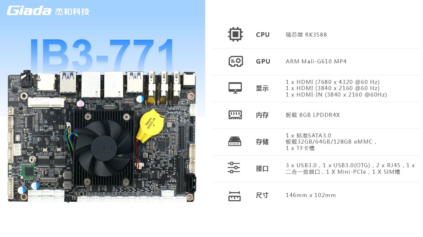 好博(中国)体育科技IB3-771支持瑞芯微旗舰级RK3568(4*A76+4*A55@2.4GHz)八核64位处理器,集成ARMMali-G610 MP4 GPU,高算力、低功耗、具备强大的视觉处理能力;性能强悍的RK3588内置AI加速NPU,提供6TOPs算力,支持 INT4/INT8/INT16/FP16 混合运算,其强大的兼容性,可以轻松转换基于TensorFlow / MXNet/PyTorch/Caffe 等一系列框架的网络模型,为各类AIoT应用场景提供优秀的性能表现;板载8GB LPDDR4X内存,支持1x标准SATA3.0接口,可扩展SSD/HDD硬盘,板载32GB/64GB/128GB eMMC,支持1 x TF卡槽,多种形式轻松增加存储容量。