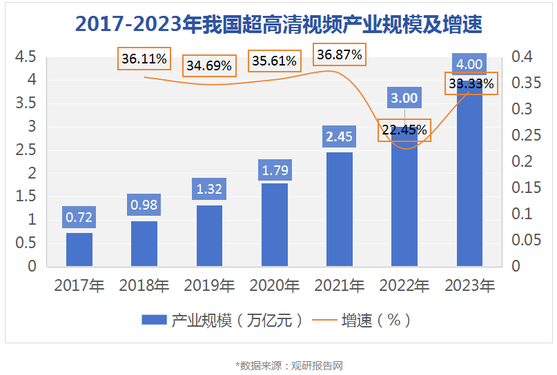 从2022年1月国务院在《“十四五”数字经济发展规划》中提及深化人工智能、虚拟显示、8k高清视频等技术的融合。到2022年,依托5G、AI、VR/AR等技术的深度发展,我国超高清视频已经形成3万亿元产业规模,超高清视频的呈现需求及产业规模影响力也正在快速增长。