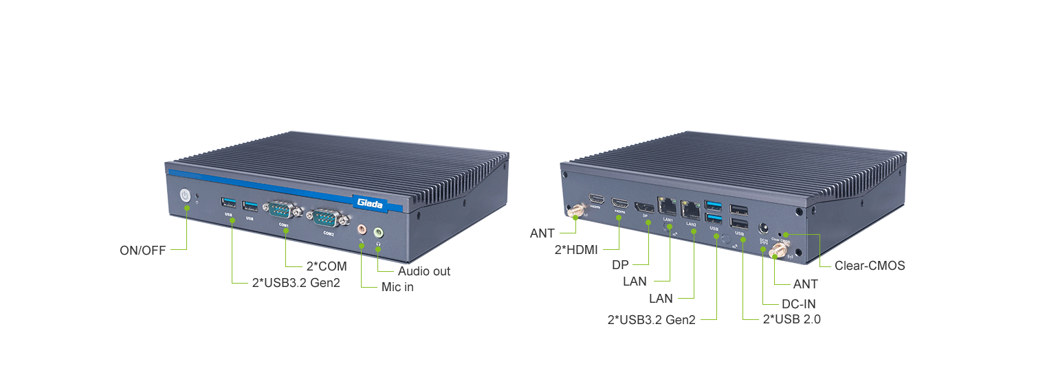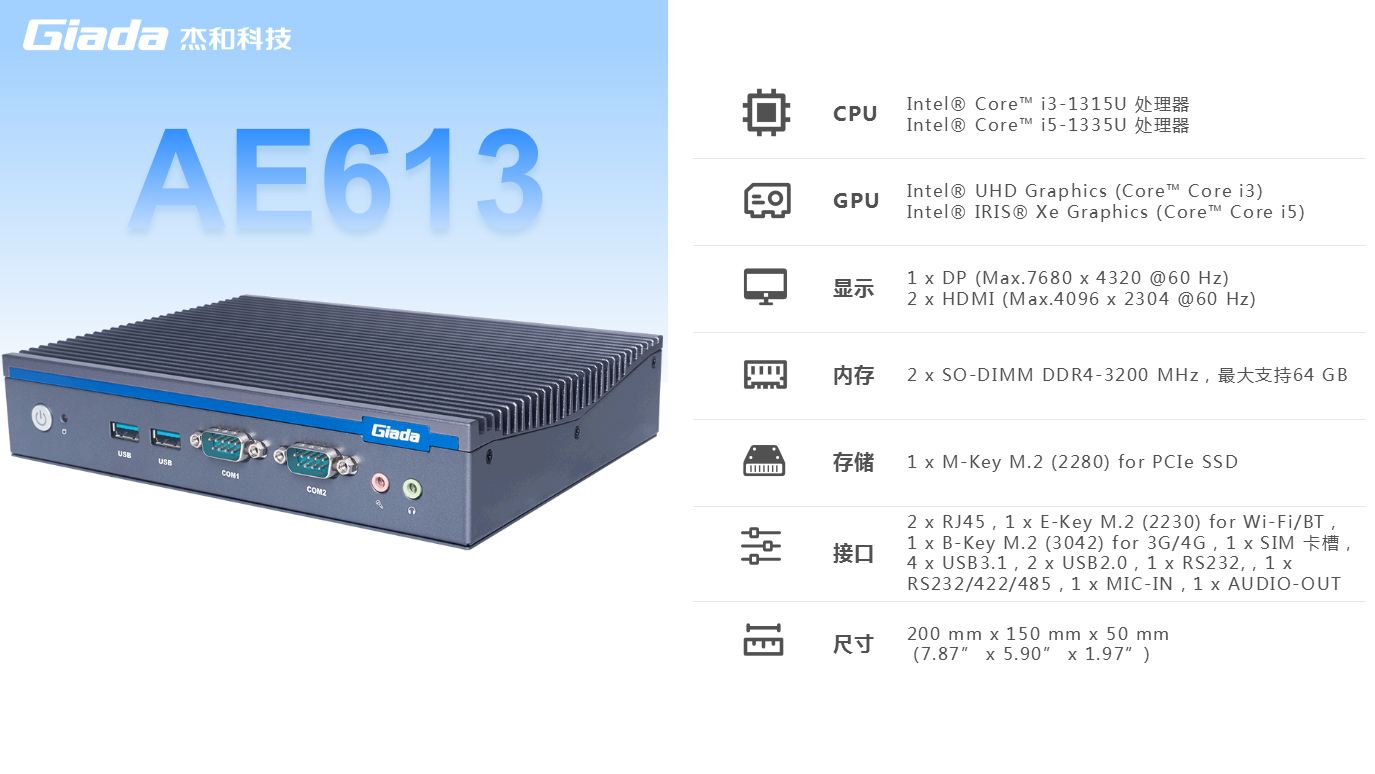好博(中国)体育科技AE613支持Windows 11 (64bit) /Linux Ubuntu (64bit)系统,双千兆自适应RJ45网口,4 x USB3.1 (10 Gbps),2 x USB2.0,1 x RS232,,1 x RS232/422/485,1 x MIC-IN,1 x AUDIO-OUT,丰富的I/O功能接口,实现更多功能扩展。