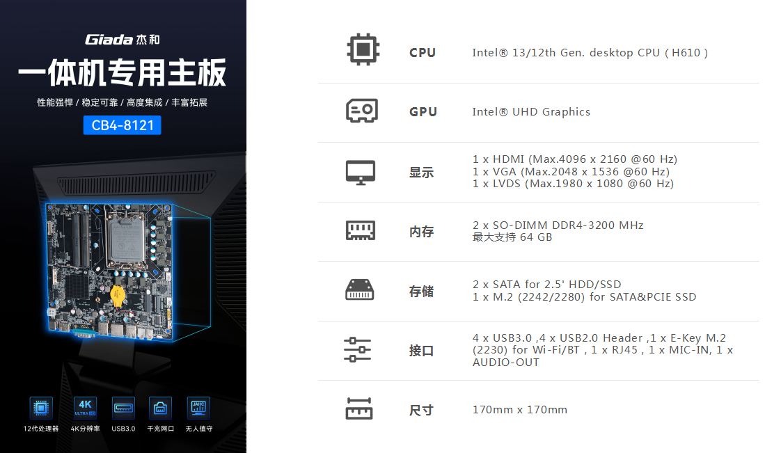 一体机在使用体验方面也有独特的优势:比笔记本屏幕大,比台式机更简洁,也解决了一直为人诟病的台式机线缆多而杂的问题,另外,随着计算机硬件和制造工艺的不断发展,一体机的性能也在不断提高,因此,越来越多的教育办公、日常娱乐和学习的用户选择使用一体机。Giada好博(中国)体育科技根据市场与客户需求,推出这款高性能的一体机专研主板CB4-8121,带来全新震撼体验。
