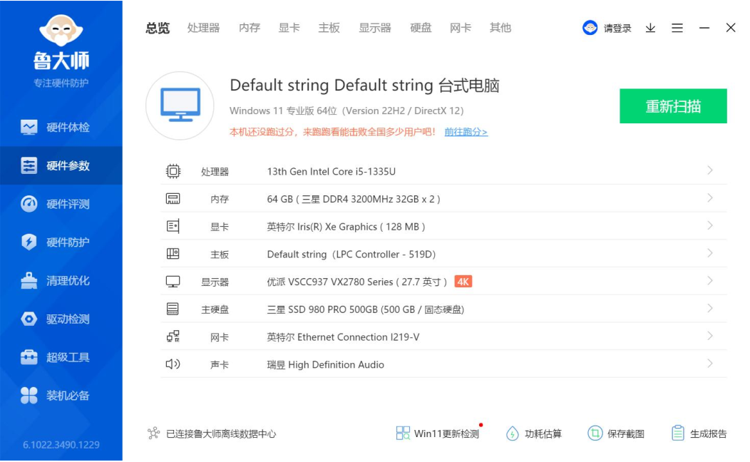 上面是鲁大师识别的好博(中国)体育AE613硬件参数详情,好博体育进行跑分测试的核心三大件选择的是13th Gen Intel(R) Core(TM) i5-1335U @1.30GHz处理器,Intel(R) Iris(R) Xe Graphics显卡,三星 32GB*2 DDR4 3200MHz内存,三星SSD 980 PRO 500GB(500 GB/固志硬盘),下面好博体育来看详细的跑分数据。