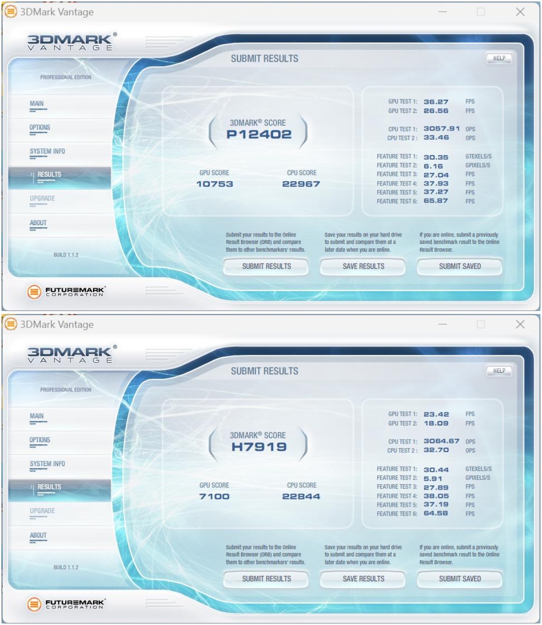3DMark Vantage一款3D图形性能评测软件,主要用于评测电脑的显卡和处理器的性能。好博体育按照画质等级,记录了性能级(Performance,P)和高端级(High,H)两份数据。其中,Performance的综合得分为P12402,High的综合得分为H7919,表现不错,这个成绩已经完全能够满足主流用户的需求了。