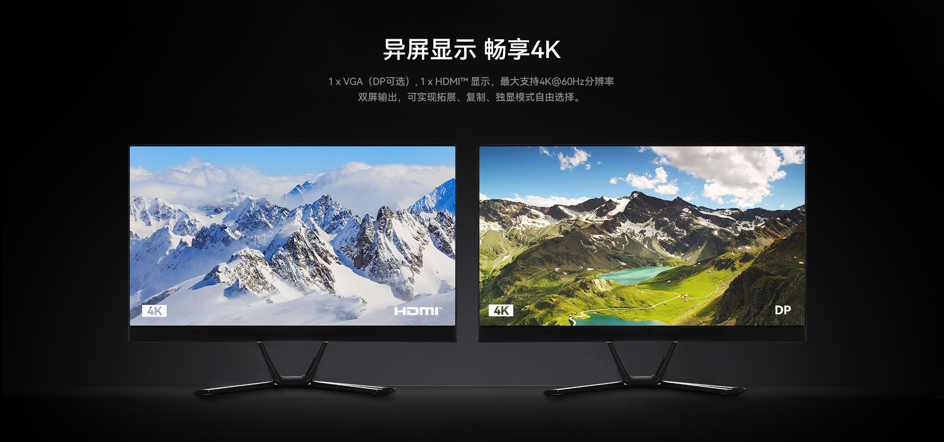 支持1 x VGA(DP可选), 1 x HDMI显示,支持4K60Hz视频输出